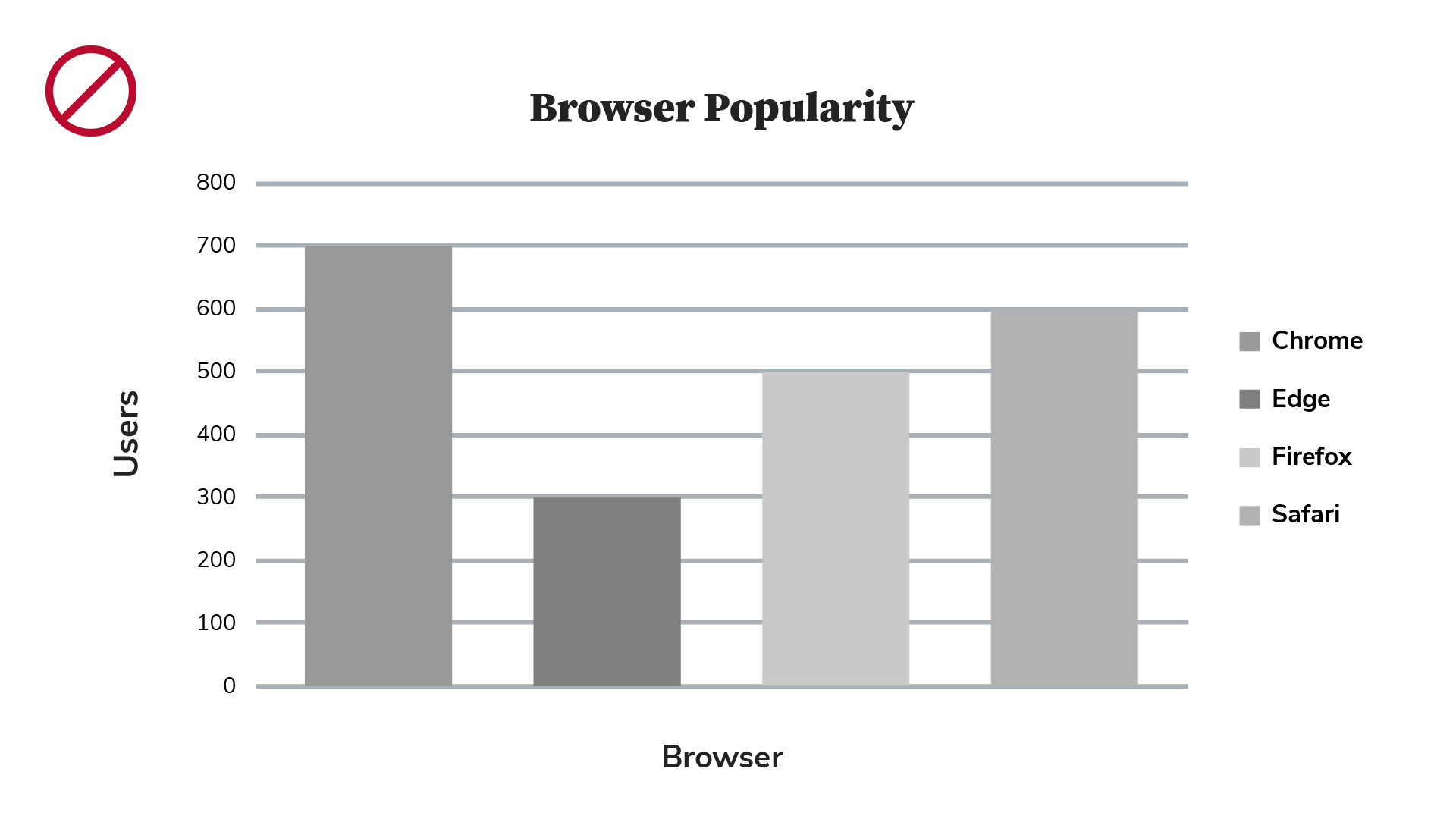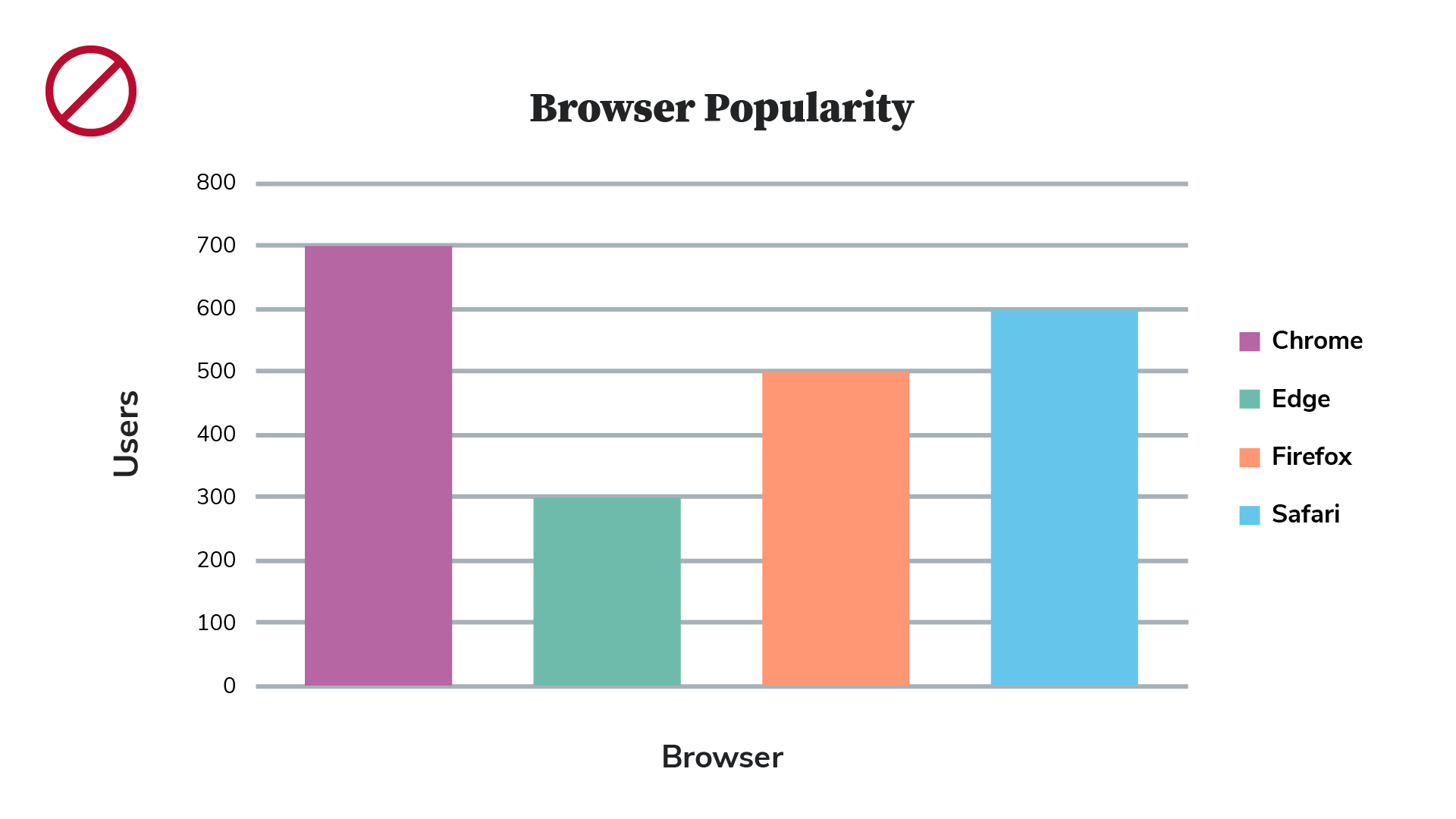 This first example of an inaccessible bar chart uses color as the only way to identify the relative popularity of several web browsers. Not everyone will be able to match up the colors to interpret the information in this chart, even though there is a legend.
