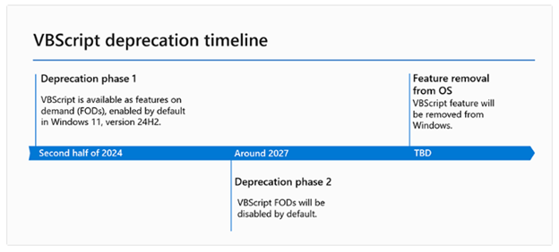 WHEN: Microsoft VBScript in Windows is currently in its first deprecation phase. Phase 2 will be completed August 2027. Dates for Phase 3 are TBD.
